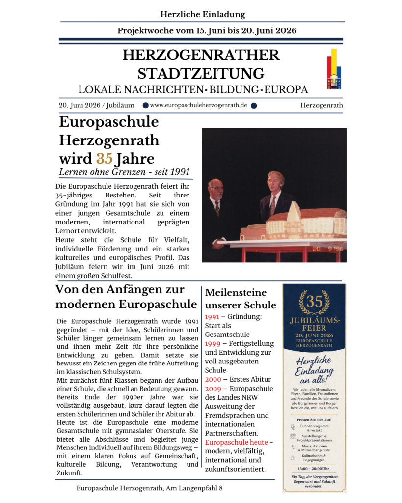 Im Jahr 2026 blickt die Europaschule Herzogenrath auf 35 Jahre Schulgeschichte zurück.